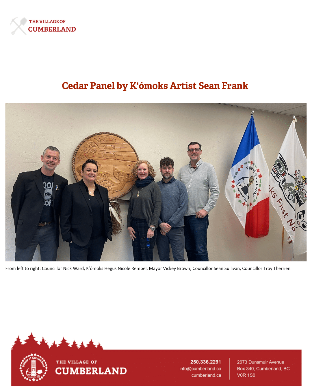 Mayor Brown and Council welcomed K’ómoks First Nation Hegus Nicole Rempel at the March 10th Council meeting to present a cedar panel art piece created by K’ómoks artist Sean Frank to the community.