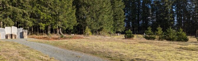 Staying true to the principles of natural burial, simple memorialization will take place through optional engraving on a common monument of black tusk basalt. Placement of personal mementoes on graves is discouraged other than at the time of interment.
